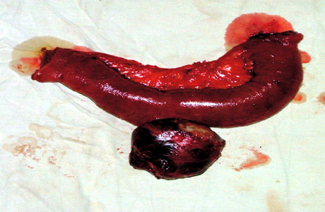 Avand în vedere evolutia bolnavului în clinica de hematologie cãtre ocluzie, se intervine chirurgical si se constatã prezenta unei formatiuni de circa 12/10 cm care înglobeazã anse subtiri, cecul si sigmoidul, descoperindu-se un abces delimitat de aceste formatiuni; din Douglas se elibreazã o formatiune tumoralã aparent bine delimitatã, perforatã, de 6/5 cm care tine de un segment ileal avand aspect de tumorã perforatã de diverticul Meckel (Fig. 3, Fig. 4, Fig. 5, Fig. 6, Fig. 7).