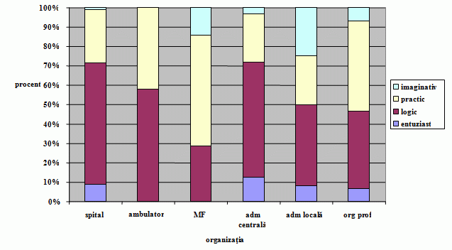 În continuarea acestui raþionament, s-a constatat cã stilul antreprenor s-a evidenþiat ca stil primar într-o pondere mult mai micã (20 – 30%), atât la furnizori, cât mai ales la administraþie ºi la organizaþia profesionalã (Graficul nr. 4). Singura excepþie a constituit-o societatea civilã a medicilor de familie, care favorizeazã cadrul antreprenorial, prin faptul cã medicii de familie îºi exercitã profesia în mod liberal ºi cadrul legal este mai precis, asistenþa medicalã primarã fiind, pânã în prezent, sectorul în care reforma sistemului este cea mai avansatã.